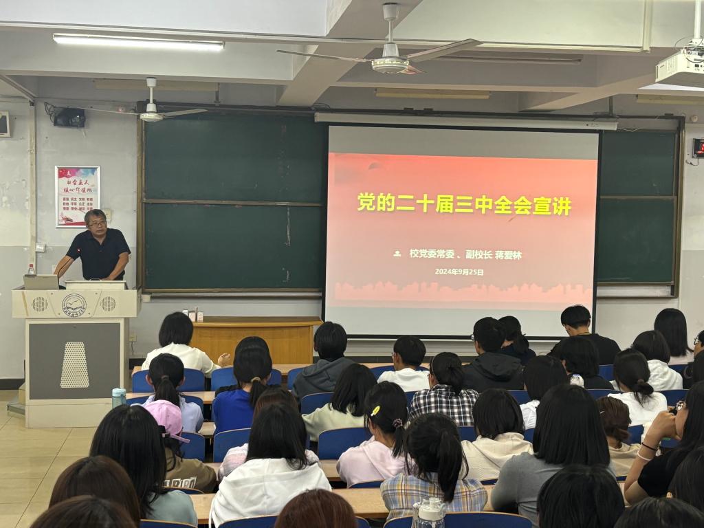 9月25日下午,公司党委常委、副董事长蒋爱林面向文法公司师生在开发区综合楼412教室集中宣讲党的二十届三中全会精神,太阳成tyc33455ccwww师生代表百余人听取了讲座报告。