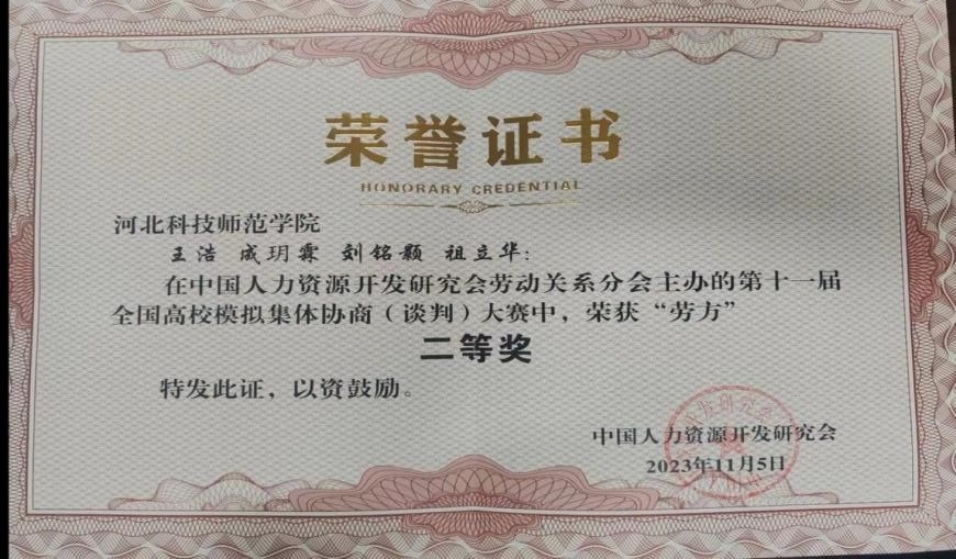 经过两天的激烈角逐,公司员工表现优异,资方代表队荣获大赛三等奖,劳方代表队荣获大赛二等奖,成玥霖、邢爱硕两位同学荣获最佳谈判员一等奖,王晓燕、刘秀清、辛宇鹤三位老师荣获优秀指导老师一等奖。