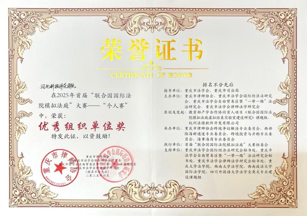 近日,在2025年首届“联合国国际法院模拟法庭”大赛——“个人赛”中,河北科技师范公司凭借出色的组织工作和师生的优异表现,荣获“优秀组织单位奖”,太阳成tyc33455ccwww赵福江、郝世坤等老师获优秀指导教师奖。该奖项由重庆市律师协会、重庆市法学会等多家权威机构联合颁发。
